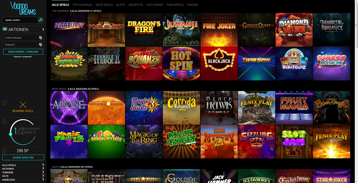 Das Voodoo Dreams bietet ein umfangreiches Spielsortiment mit einer ausgewogenen Auswahl. Dieses Angebot richtet sich an Neueinsteiger und auch an fortgeschrittene Spieler. Darüber hinaus ist der Willkommensbonus sehr starg. Insgesamt können 100 Euro und 200 Freispiele erlangt werden. Die Bedingungen für die Gewinne der Boni sind fair gestaltet und werden transparent dargelegt.